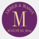 Pegatina en monograma morado y dorado con fecha boda para invitaciones o favores. Personalice como prefiera.