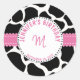 Pegatinas personalizados de redondeo de impresión en vaca negra monograma rosado para cumpleaños. Utilícelos para hacer bolsos de favor o sello para sobres para enviar invitaciones por correo. A ella le encantarán las cintas rosadas y las huellas de vacas.