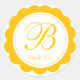 Este versátil diseño es perfecto como pegatina, sello para sobres y mucho más. Este diseño presenta un círculo de vieiras amarillas y blancas con un monograma de una sola letra y gracias en el centro. Por favor, no dudes en contactarme a través de la función de mensaje si necesitas ayuda con este diseño o si quieres añadir una personalización diferente. O puedes contactarme por correo electrónico en zazzlestores@yahoo.com.