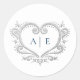 Pegatina Redonda Monograma de corazón plateado texto azul sobre bod