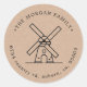 Moderno pegatina de una casa de campo con un ilustracion de molino de viento rodeado de un nombre familiar personalizado y dirección de retorno con un elegante tipo de letra.