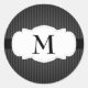 Este pegatina redondeado presenta un fondo vertical pinstripe negro y gris con un marco giratorio blanco en el centro. El texto del personalizable le permite añadir su monograma.