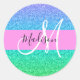 El purpurina de sirena azul grisáceo y azul glamuroso, verde, aqua y turquesa deslumbra el nombre del monograma gradiente y el pegatina redondo clásico inicial. Su nombre personalizado y su monograma están escritos en un guión elegante con letras a mano con un fondo rosado. ¡Un regalo perfecto de cumpleaños o Navidades!