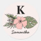 Pegatina Redonda Monograma de hojas tropicales rosadas y verdes