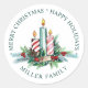 Diseño pegatina de vacaciones con velas decoradas con Navidades y ramo de vegetación invernal con texto de personalizable.