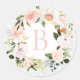 Hermosa corona de flores botánicas y encajes de jardín pastel, pegatina monograma.