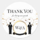 Un pegatina boda de agradecimiento con un diseño de dos novios, parado a ambos lados del monograma de una pareja. El pegatina está decorado en tonos blancos, negros y dorados. Este artículo forma parte de un conjunto de bodas que incluye una invitación a la boda, una tarjeta rsvp y más. (Los elementos de oro del conjunto son de oro falso y no de Relieve metalizado de oro). Monograma masculino Boda oro LGBTQ Pegatina redondo clásico de vacaciones diseño | ©Melissa Patton Designer