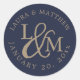 boda característica sus iniciales trabajadas en un diseño de monograma, junto con un marcador de script decorativo. Sus nombres y la fecha de su boda aparecen con letras blancas, curvadas alrededor del exterior.