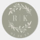 pegatinas en monograma de boda botánico diseñado por personalizados que presentan una elegante corona beige blanca con las iniciales de la pareja y la fecha boda sobre el fondo del color de la salvia. Perfecto para la boda, ahorra las fechas, sobres, paquetes de favores de boda y más.