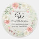 Diseño rústico campestre chic con madera de cabaña gris blanquecina suave, fondo de tablón de shiplap. Estos son sellos de sobre de devolución de dirección redondos con su monograma, nombre y dirección. Perfecto para agregar un toque decorativo y sellar sobres para invitaciones de boda y fiestas de despedida de soltera. Rosas florales rosa e ivorio pintadas a mano con follaje de hoja de eucalipto sembrado por la artista, Audrey Jeanne Roberts. Derechos de autor.