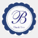 Elegante pegatina de círculo de vieiras azul con una inicial de una sola letra y "Gracias" en el centro. Perfecto para pegatinas, sellos para sobres, papelería para bodas, duchas para bebés, duchas de novias y favores de fiesta personalizados. Un diseño versátil y de personalizable para cualquier ocasión.