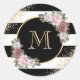 Pegatina Redonda Monograma floral rosa personalizado en negro y dor