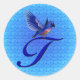 Elegante letra de monograma T con un pegatina o etiqueta de pájaro azul bonito. Haga clic en el Personalizar para agregar cualquier texto que desee personalizar este elemento. ¡Buena idea de regalo! Por favor visite los Monogramas de Smilin' Eyes para ver más tarjetas y regalos con flores, naturaleza y arte digital monogramados.