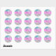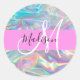 Nombre de monograma iridiscente holográfico del arcoiris grisáceo y pegatina redonda clásica inicial. Su nombre personalizado y su monograma están escritos en un guión elegante con letras a mano con un fondo rosado. ¡Un regalo perfecto de cumpleaños o Navidades!