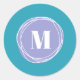 El diseño muestra tu monograma dentro de un círculo abstracto de color periwinkle (púrpura claro) en un fondo azul aqua.