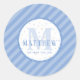 Monograma personalizado pegatina redondo de bebé. Personalizado inicial, nombre y fecha rodeados por las estrellas y rayas diagonales. Una ducha perfecta para bebés o la idea de un regalo de primera cumpleaños. Combinación tradicional de color azul pastel, blanco y caqui suave. Añade el nombre y el monograma con la herramienta de edición de Zazzle fácil de usar! Visita la tienda para ver toda la colección. Hay carteles, bollos, cajas de favores, botellas de agua, trajes para el cuerpo y mucho más disponible. Y por supuesto, ¡también hay bocadillos y máscaras en la tienda!