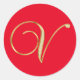 Monograma V dorado ornamentado sobre fondo rojo brillante.