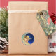 Whimsical lindo rubio de cabello rubio, ángel romántico de ojos azules colgando en la Luna con una brillante piedra de zafiro azul 3D.