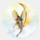 Un hermoso hada sentada en la luna naranja entre las nubes esparciendo polvo de hadas. Disponible en varios colores de fondo para la mayoría de los productos.