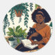Pegatina Redonda Mujer relajándose con su gato, libro y plantas