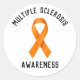 Spread awareness and show your solidarity with this clean, bold Multiple Sclerosis awareness round sticker. Featuring the iconic orange ribbon front and center, "Multiple Sclerosis" arched in strong block lettering at the top, and "Awareness" in bold text at the bottom — all on a crisp white background that keeps the focus on the message. Versatile and eye-catching, these stickers are perfect for decorating water bottles, laptops, notebooks, car bumpers, envelopes, and personal belongings. Ideal for MS awareness walks, fundraising events, charity drives, support group handouts, awareness month giveaways, and neurology clinic waiting rooms. A simple yet impactful way to honor MS warriors, show support for loved ones living with Multiple Sclerosis, and help keep the conversation going. Order in bulk to share at community events and spread the orange ribbon message far and wide.