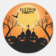 Use este clásico pegatina redondo para acompañar la aterradora invitación a su fiesta de Halloween. Tiene un fondo naranja claro con un sol abrasador frente a un cementerio con calabazas con la frase 'Partido Halloween' en una tipografía espeluznante negra.