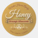 Icono simple de abeja miel con un pergamino ornamental y banner para la miel Naranja Blossom, o personalizado para cualquier variedad, con el nombre del apicultor o negocio apiario, características del producto, peso neto e información de contacto.