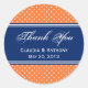 Patrón de puntos de polka blanco y naranja con acento azul real. El pequeño polka blanco pega sobre el naranja y en el medio hay un rectángulo azul real, el texto "Gracias", los nombres de la novia y del novio y la fecha. Boda Gracias pegatinas.