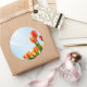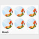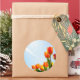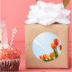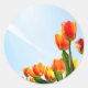 Pegatina fotográfico redondo con flores de tulipanes naranjas y rojos vistos desde un punto de vista bajo contra un cielo azul.