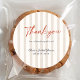 Sweet and simple round thank you stickers for your "She's a Catch" lobster-themed bridal shower! Featuring elegant beige watercolor stripes with bold red "Thank you" script and "for celebrating with us!" message. Fully customizable with the bride's name and event date – perfect for sealing favor bags, envelopes, thank you cards, or gift boxes.