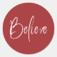 Pegatina temática navideña roja y blanca con el sentimiento “Believe” que hace que sea la adición perfecta para todos tus sobres de correo de vacaciones o decoraciones. ¡100% de satisfacción del cliente con “Zazzle” todos los días!