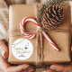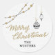 Agrega un toque de elegante festividad moderna a tus regalos navideños con esta etiqueta de adorno navideño negro y dorado dibujada a mano. Con delicados adornos colgantes, cálida letra manuscrita dorada que dice “Merry Christmas” y espacio para personalizar con el nombre de tu familia, este diseño coordina perfectamente con las tarjetas, papel de regalo y etiquetas de regalo de la misma colección. Ideal para sellar sobres, decorar regalos o agregar un toque final elegante a tu embalaje navideño.
