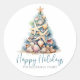 Felices Fiestas Beach Árbol de Navidad Clásico Pegatina Redondo. Difunde alegría por las vacaciones en la playa con este único pegatina redondo que presenta un árbol de Navidad hecho de conchas y peces de estrella. El árbol, coronado por una estrella de mar, está diseñado en tonos azules y verdes que recuerdan a los corales submarinos y se encuentra en una base de arena. Este pegatina rústico de acuarela es perfecto para cualquiera en lugares tropicales como Florida, Hawái o Bahamas, o para cualquiera que ame el ambiente de la playa. "Felices Fiestas" está escrito en la parte superior en un elegante tipo de letra de guión, añadiendo un alegre toque estacional. La mezcla de tipos de letra simples y tipografía de guiones mantiene el aspecto elegante pero relajado. Ideal para decorar sobres de tarjetas de vacaciones, para fiestas o para añadir un toque costero a tus vacaciones.