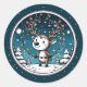 Capturar la magia de las vacaciones con este ilustracion encantador de un reno alegre y entremezclado con coloridas luces Navidades. Rodeado de un cielo estrellado de noche con pinos enlucidos y una luna creciente brillante, este diseño circular irradia una acogedora alegría de invierno.