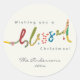 Este Navidad saluda al pegatina con la colorida palabra pintada a mano "bendecido" con hermosos detalles artísticos. Es parte de una colección de tarjetas de felicitación con fotos de Navidades, pegatinas y etiquetas de direcciones y devoluciones, así como de ornamentos.