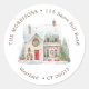 Etiqueta de dirección de tarjeta de navidades. Bonita casa cubierta de nieve con decoraciones navideñas. Puede cambiar el texto de acuerdo con sus requisitos