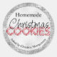 Estas glamorosas etiquetas pegatinas personalizados presentan un diseño festivo con globos rayados de caña de caramelo rojo y blanco. La palabra cookies está impresa en globos de Relieve metalizado con un patrón de bastón de caramelo sobre un fondo plateado. La palabra Navidades se imprime arriba en una elegante letra de guión. En la parte inferior se imprime un nombre de ejemplo que puede personalizar para incluir su propio nombre u otro texto personalizado. Un falso borde de diamantes de plata rodea al pegatina. Es perfecto para etiquetar galletas caseras de Navidades horneadas.
