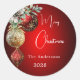 Para una fiesta de Navidades favores o envoltura de regalo. Un fondo rojo de color desigual. Decorada con baudias rojas y doradas, con un poco de vegetación y un cono de pino. Personaliza y agrega tu nombre, año. Texto: Feliz Navidad