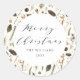 Un pegatina moderno y elegante, Navidades de diseño, con una delicada cita suave "Feliz Navidad" y textos personalizados en un simple círculo blanco. Su fondo es un patrón de moda boho de acuarela botánica, follaje, conos de pino, hojas de pino, bayas y algodón que le da una acogedora atmósfera vintage de vacaciones.