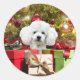 Adorable pequeño caniche blanco pasa Navidades esperando debajo del árbol entre los presentes amantes del perro Navidades pegatina de vacaciones