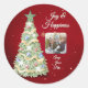 Envíe sus cálidos deseos esta temporada navideña con nuestra caprichosa acuarela alrededor de los pegatinas de los árboles navideños. Agrega tu foto favorita para personalizar estas adorables adiciones a tus regalos y cartas. Este encantador diseño muestra un bello árbol de Navidad ilustrado en ricos tonos verdes, adornos de cintas y copos de nieve. Este pegatina redondo, situado sobre un fondo estelar rojo festivo, irradia alegría por las vacaciones. Es el estilo perfecto para compartir alegría y calidez con la familia y los amigos.