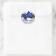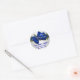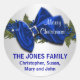 Un hermoso pegatina redondo con una cinta de satén de cobalto y azul marino FAUX descansando en una corona de Navidad llena de bayas de nieve y hojas verdes que tiene las palabras, Feliz Navidad, y una plantilla para el nombre de tu familia, que aparece en un vibrante fondo gris plateado. IDEAL PARA - Decorando sus productos de papel y presenta esta temporada navideña.
