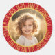 Pegatinas de fotos que muestran tu foto dentro de una imagen impresa de un borde de ráfagas de sol gradiente dorado sobre un fondo rojo.