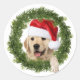 Curado recuperador dorado en corona de pino verde con gorra y copos de nieve.