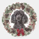 ¡Mira esa hermosa cara de perro de Poodle negro enmarcada por un cono de pino acuarela de bonito y corona de moras rojas! La imagen del perro está en el centro sobre un fondo blanco. Un brillante arco rojo le da un poco de brillo a la corona a los Navidades. Perfecto para sus paquetes de vacaciones o correspondencia.