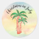 Estos pegatinas están decorados con una divertida acuarela de palmeras decoradas como árboles de Navidad en un fondo colorido. A medida que creamos nuestra obra de arte no encontrarás esta imagen exacta de otros diseñadores. Acuarela original © Michele Davies.