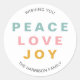 Una pegatina navideña moderna y minimalista con colores alegres para difundir alegría y amor esta temporada navideña. Un mensaje de personalizable de "Deseándote" es seguido por "Paz", "Amor" y "Alegría" en colores verde azulados, rosados y dorados y tipografía simple. Puedes personalizar con tu apellido.