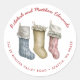 Estos sellos para sobres cuentan con tres medias (azul, canela y franja roja y blanca) en el centro. La parte superior del pegatina tiene un nombre en texto curvo y la parte inferior tiene una dirección en texto curvo.