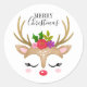 Un lindo rostro de reno decora este pegatina con las palabras Feliz Navidad. Diversión para decorar regalos de Navidades y bolsas de regalo para las vacaciones para los vecinos. Diseñado para ti por Blackberry Boulevard.