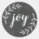 sellos para sobres de Navidades diseñados por personalizados y pegatinas de regalo con escritura de "alegría" a mano con ramas de pino blanco sobre el fondo estilo pizarra.